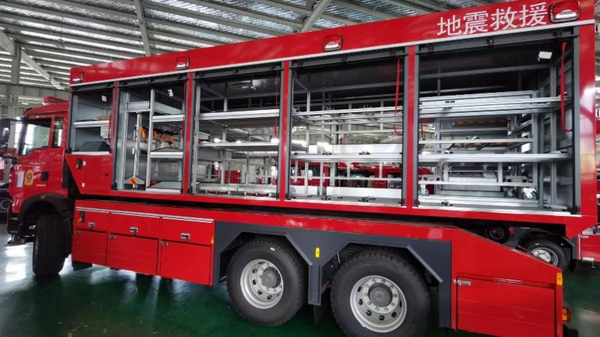 3.2 | 多功能器材模塊箱:箱體左右兩側設有防水、防塵的鋁合金卷簾門,卷簾門觸發電磁傳感器自動開關LED照明。箱體內根據器材使用方式不 同設置有各種專用拖架、破拆工具拖架、抽屜、推車模塊、可調器材盒等機構放 置和固定各種器材裝備,在裝卸和運輸過程中不會發生移動。可放置器材:130件 |