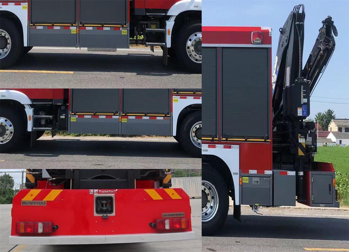 3.3 | 車后部設有登頂爬梯,能使消防人員迅速登上車頂,梯子和踏板站立面均做防滑處理;車頂設有防護欄板,車頂鋪設滑板以確保人員在車頂安全行走。 |