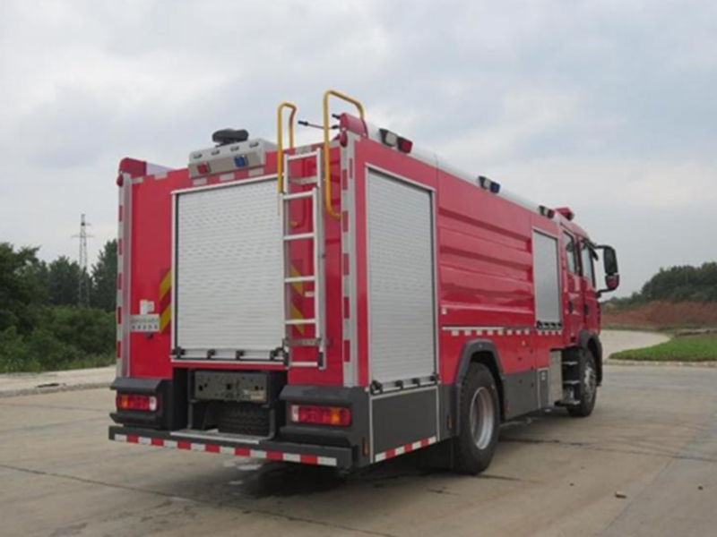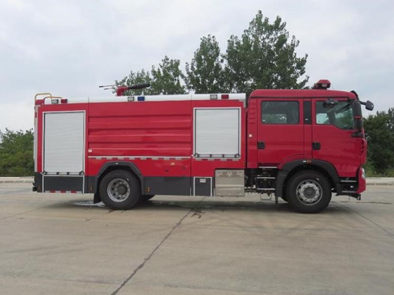 豪沃單橋水罐消防車,整車由二類汽車底盤、罐體、消防泵、管路、儀表電路系 統等部件組成,原裝雙排駕駛室可乘坐2+4人;該車為外露罐結構,車身前部為器材 箱構成,中部為水罐,尾部為泵房。水罐為碳鋼材質,內部噴涂環氧底漆和環氧瀝青